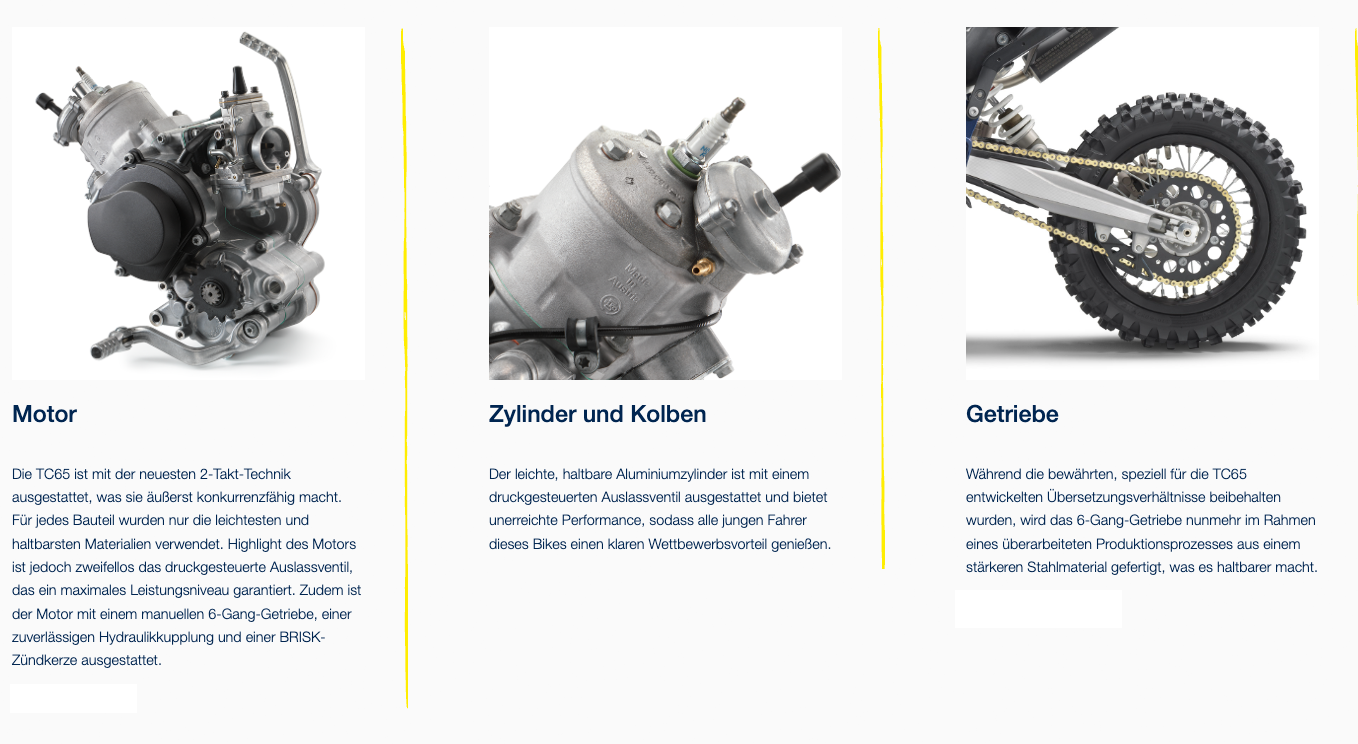 Nicht zuletzt dank mehrerer technischer Änderungen wird die TC 65 des Jahrgangs 2024 ihre Marktposition als bestes Motorrad der 65-cm³-Klasse mühelos halten. Für viele junge Fahrer wird sie das erste Motocross-Modell mit manueller Kupplung und Getriebe sein. Aus diesem Grund haben sich unsere Ingenieure für eine besonders leichte Hydraulikkupplung und ein leichtgängiges 6-Gang-Getriebe entschieden. Die TC 65 wird noch vielfältigeren Anforderungen der jüngsten Fahrer gerecht. So bietet das neue Fahrgestell verschiedene Möglichkeiten zur ergonomischen Anpassung. Hinsichtlich der Leistung versprechen ein neuer Endschalldämpfer, eine DS-Kupplung, Formula-Bremsen und ein größerer Twin Air-Luftfilter ein einzigartiges Fahrerlebnis.